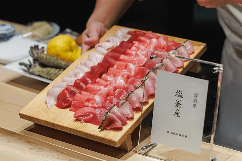 本マグロの水揚げ量日本一を誇る宮城県・塩釜から本マグロを直接仕入れており、新鮮な本マグロを寿司だけでなく、刺身、ステーキ、すき焼き、太巻きなど豊富な品数で提供しています。最高級の本マグロのありとあらゆる部位を、熟練の技で余すところなく堪能できます。