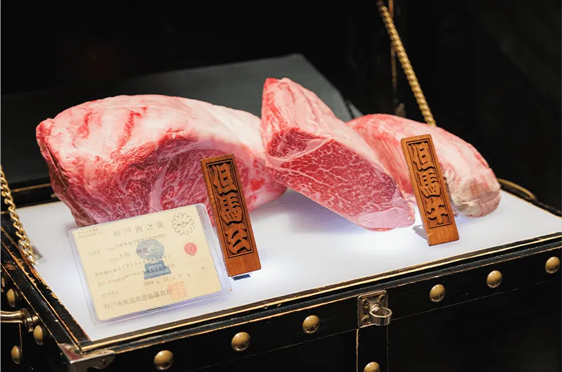 日本市場で手に入る最高品質の和牛を決める要素は3つあり、それは牛の品種、育て方、そして育てられた期間です。「今回は、通常28〜30か月程度飼育されるところ、54か月飼育された松坂牛と、50か月飼育された神戸牛の、いずれも未経産の雌牛が用意されています。長期肥育された牛は味わいがより純粋になるとともに、筋肉が緩み柔らかくなるので、肉の旨味を感じつつ、肉質が柔らかい状態になります。そして、田中氏自身が市場に足を運び牛肉の質を自らの目で見て判断し、自ら競りに参加して入札価格を決めます。」と浜田氏は説明します。