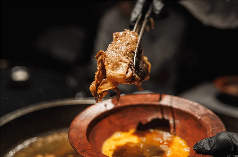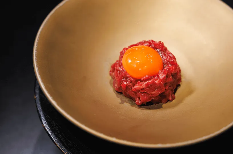 また、お肉の厚さにあわせて焼き加減を絶妙に調整するなど、目の前で中居が1品1品丁寧に調理し、さらに生卵の黄身を崩さずに卵白のみをメレンゲ状に泡立てる独自の技法を用いて、美味しさを引き立たせます。