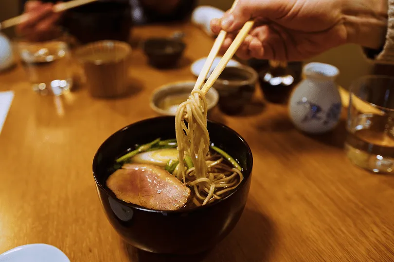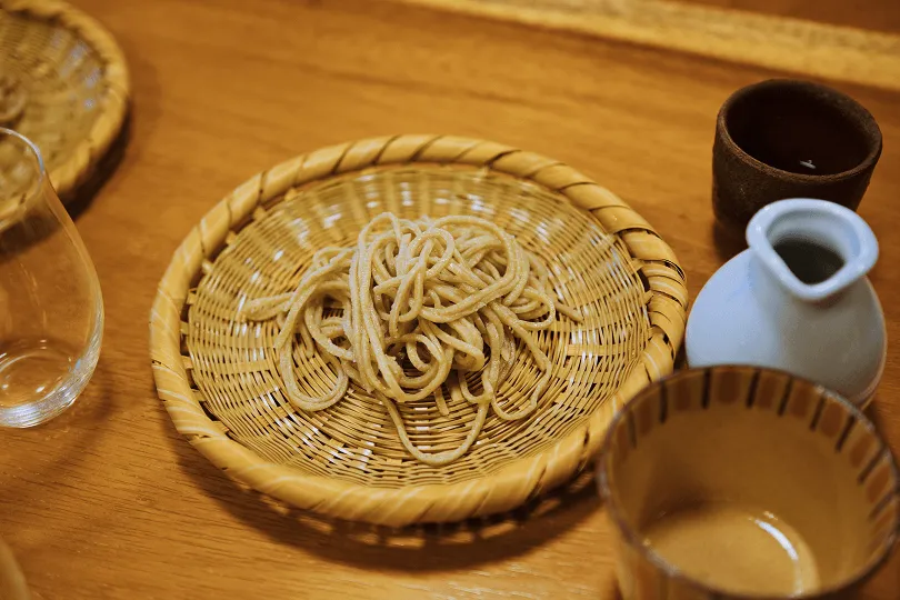 「そばは、最初は何もつけずにそのまま試してください。その後、塩だけ、または山葵と塩を少しつけて楽しんでください。最後に、そばつゆにつけて食べるといいでしょう。麺自体の風味が豊かなので、つゆなしでも十分楽しめると思います。」