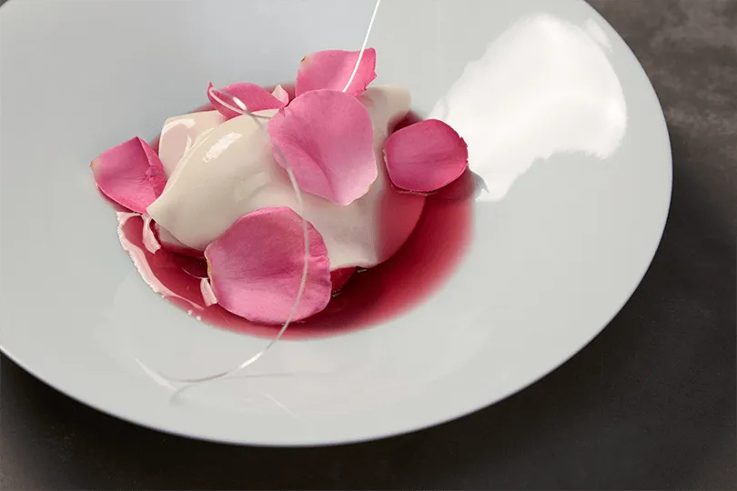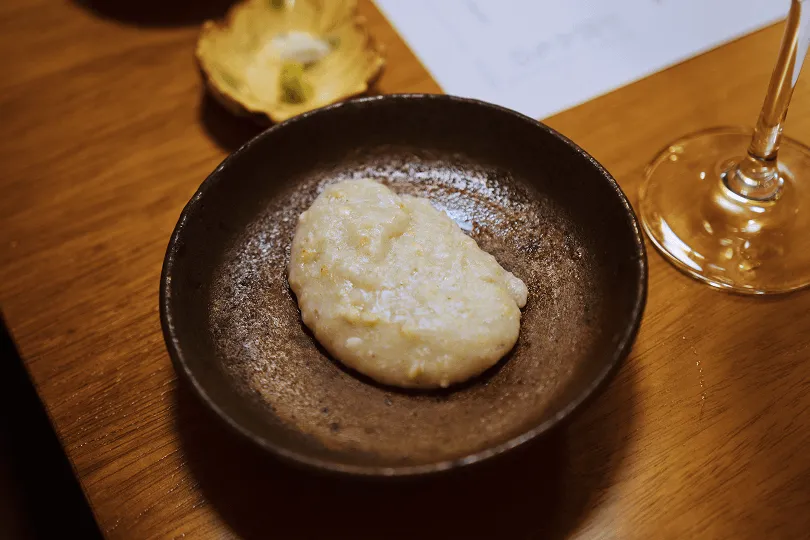 最初の一皿「薔薇と檜とアーモンド」は、見事な調和で森の中にいるような感覚を表現しています。