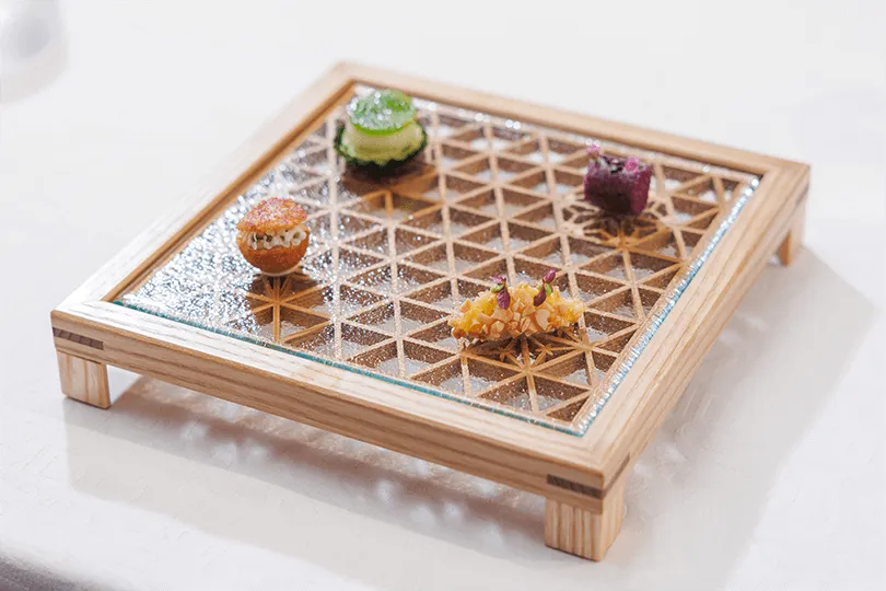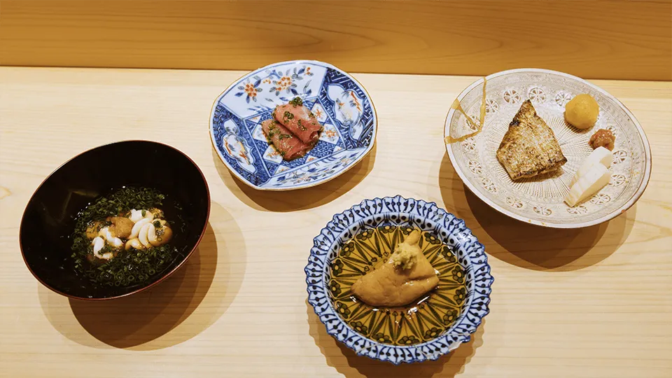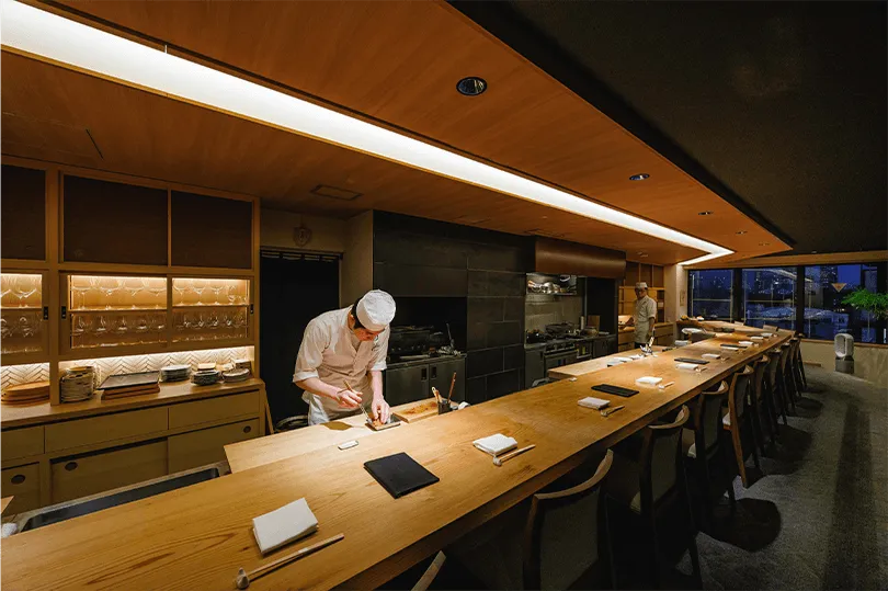 バーカウンターは8席のみ、テイスティングメニュー形式で一切れずつ提供されます。浜田氏は、「8席(あるいはそれ以下)の小規模な店で独自の体験を創り出したいと望むなら、東京という環境は、特別にそれを可能にする準備が整っている」と説明します。