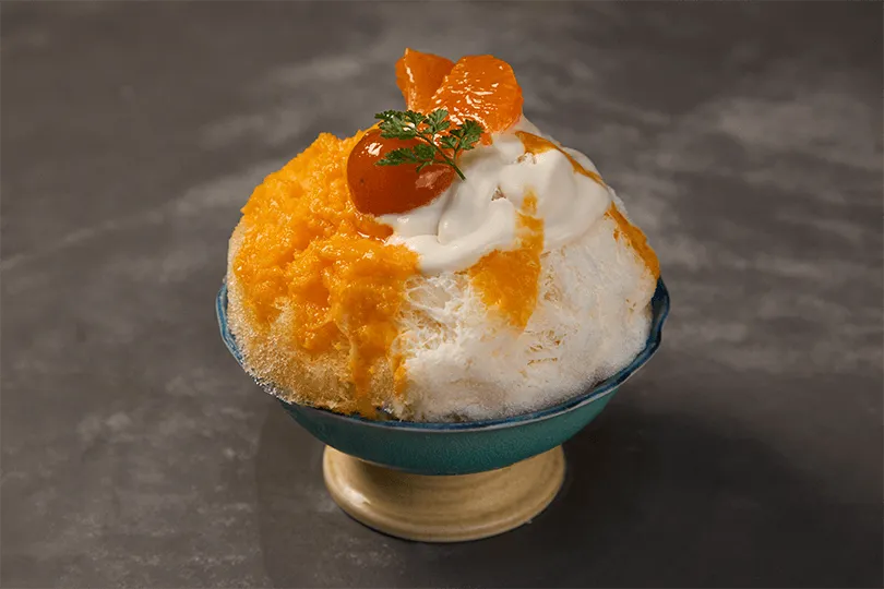 ふわりと舞い落ちる削り氷に、みかんと金柑のトッピングから新鮮な果実の風味が広がるかき氷には、「こんなに食感がふわふわとしたかき氷を食べたことがない。冷たさを感じさせない技術も素晴らしい」との声も。