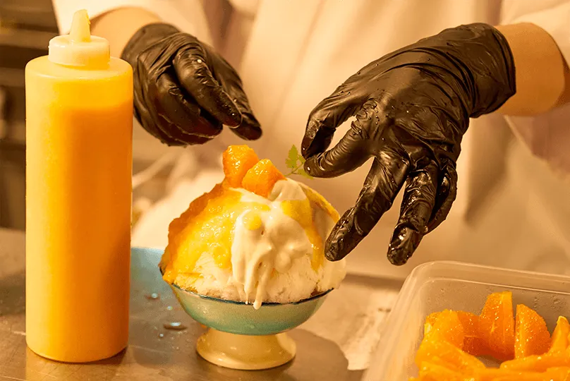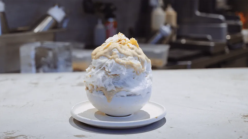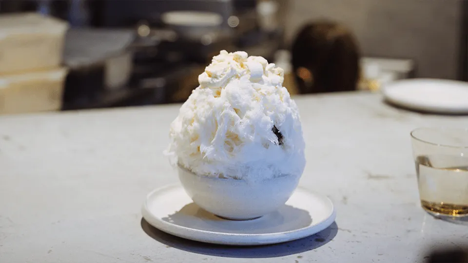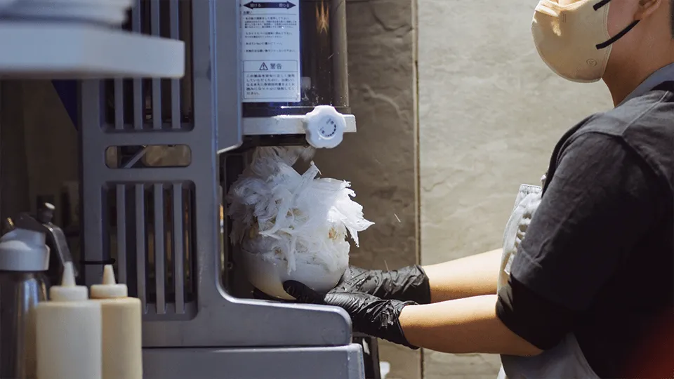 かき氷の要となる氷の質感は、水のミネラル含有量で決まります。日本の水は元々ミネラル分が少ないのですが、堀尾氏は湧水を使用した長野県の製氷業者にたどり着き、自身が描く食感を実現できる氷を手に入れることができたとのこと。