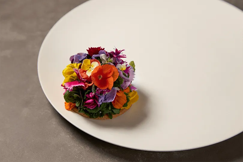 パティシエの加藤 峰子氏は、2024年のAsia's 50 Best Restaurantで、「アジアのベスト・ペイストリー・シェフ賞」を受賞しています。代表作でもある「花のタルト」は、20種類もの季節の花やハーブを使って里山の風景を表現していますが、この鮮やかな花は日本各地の農家に直接依頼して栽培してもらっているとのこと。