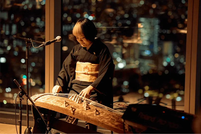 世界で活躍する箏奏者・明日佳氏が奏でる琴の音色と、ピアニスト・作曲家・DJとしても活躍する野崎良太氏(Jazztronik)が織りなすピアノの調べで幕を開けました。