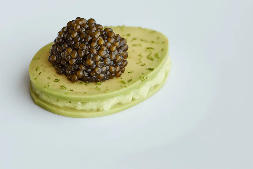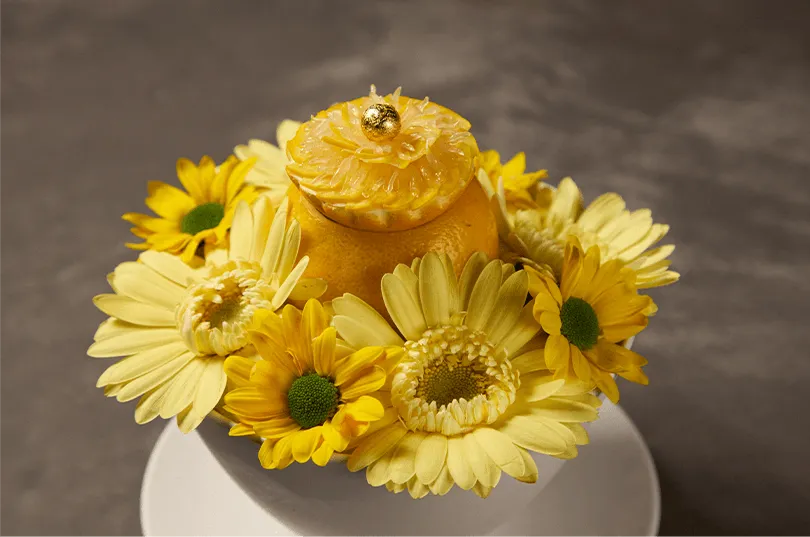 続く2品目は、東京湾のカツオ、バジル、ヘーゼルナッツのタルタルを詰めたレモンの器と、それを覆う蓋には黄色ズッキーニと柑橘の粒が並べられており、まるでアート作品のような「ポメロフラワー」。