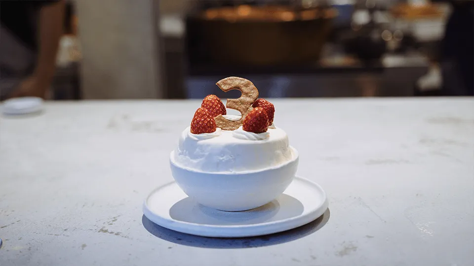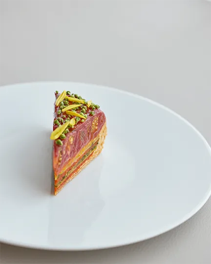 滑らかで柔らかなソルベの上には薔薇の花びらが舞い、その下には檜の香りとアーモンド、そして東京産の苺が顔を覗かせています。