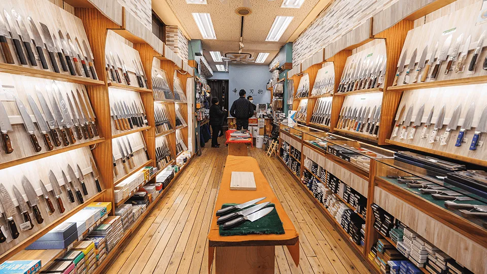 また、通りには包丁の専門店も多く並んでおり、洗練されたデザイン、美しい刃、滑らかな切れ味が人気です。