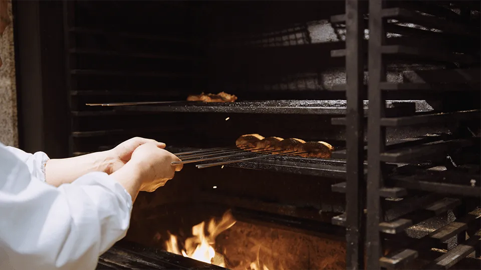 ここでは、伝統的な炭火の代わりに、薪火で串を焼きます。オーナーの末富 信氏は、海外、特にスペインでの経験からインスピレーションを得たそうです。「長年培った焼き鳥の調理技術とスペインのアサドールの調理技術の融合、一種のフュージョンスタイルといえます。普通、焼き鳥には炭火を使いますが、ここでは薪火。そこに、100%日本の食材を使用しています。これは新しい試みです。新世代の焼き鳥店といえるでしょう。」と浜田氏は説明します。
