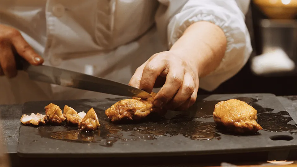 薪火での調理により香ばしい香りが得られますが、薪には水分が含まれるため、皮はパリッと、中はジューシーに仕上げることが難しい。しかし末富氏と料理長の疋田 豊樹氏は、技術を獲得することでこれらの課題を克服してきました。また、秋田の比内地鶏や群馬の高崎地鶏など、薪火で焼くのに最適な鶏肉を見つけるため、日本各地を巡ったとのこと。