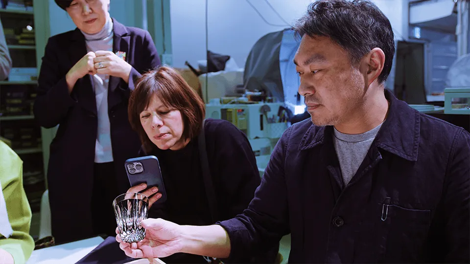 堀口氏や三澤世奈氏をはじめ江戸切子の職人たちは、何時間もかけて繊細な切子を丹念に制作しています。「私達の作る江戸切子は、顧客が器を使用して初めて完成するよう設計している。つまり作り終えた時が完成ではなく、使われた時に完成を迎えます。飲食店向けに制作する場合は、飲食店の方々と直接会話し、どのような台に置かれたり、どのようなしつらえの中で器が使用されるのか、利用シーンを綿密に打ち合わせながら最も美しく見えるように器を設計します。」と堀口氏は説明してくれました。目の前でグラスにお水が注がれた時、江戸切子は最も美しく輝きを放ちました。